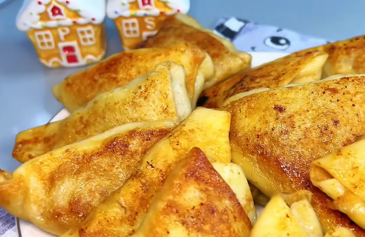 Каждый блин разрежьте пополам. На край каждой половинки выложите начинку и сверните в треугольник. Обжарьте блины под крышкой на сковороде с обеих сторон до готовности начинки.