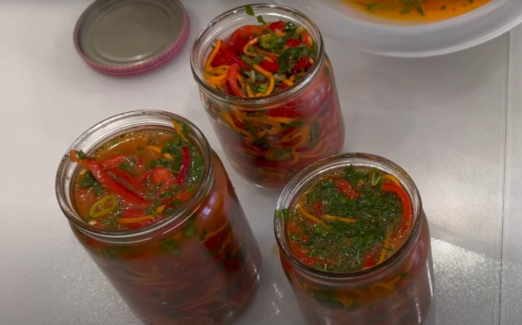Разложите массу по банкам и залейте маринадом. Накройте крышками и поставьте банки в кастрюлю с полотенцем на дне.