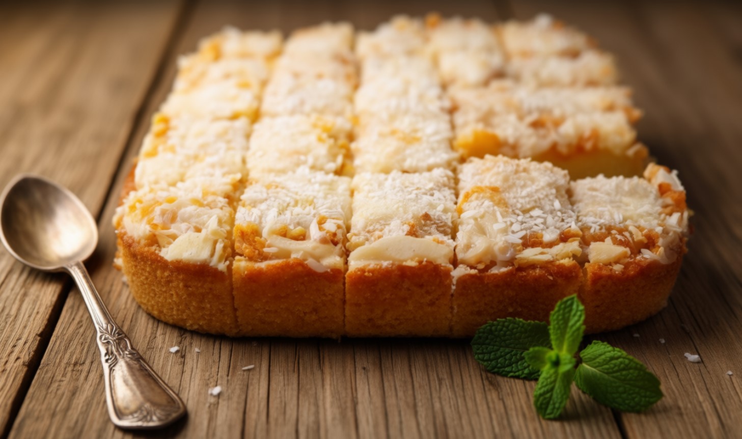 Остудите пирог, полейте сгущённым молоком и при желании посыпьте кокосовой стружкой.