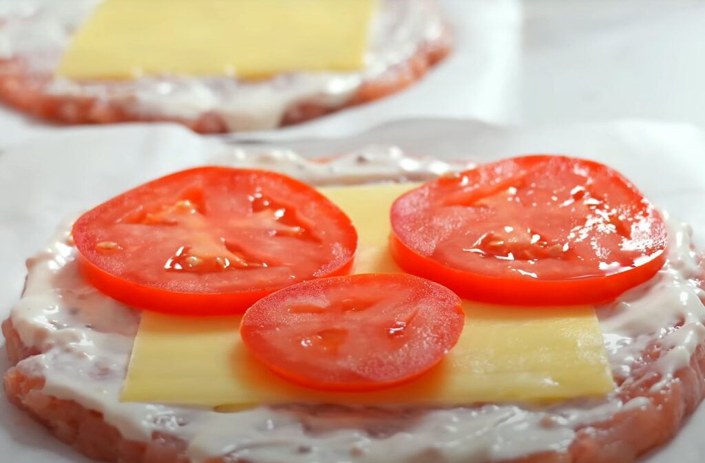 Получаются сочные и полезные котлеты с начинкой из сыра и помидора, которые можно подавать с картофельным пюре или крупами.