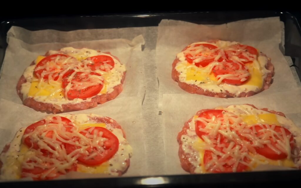 Смазать котлеты сметаной, посыпать сыром, выложить сверху кольца помидора.