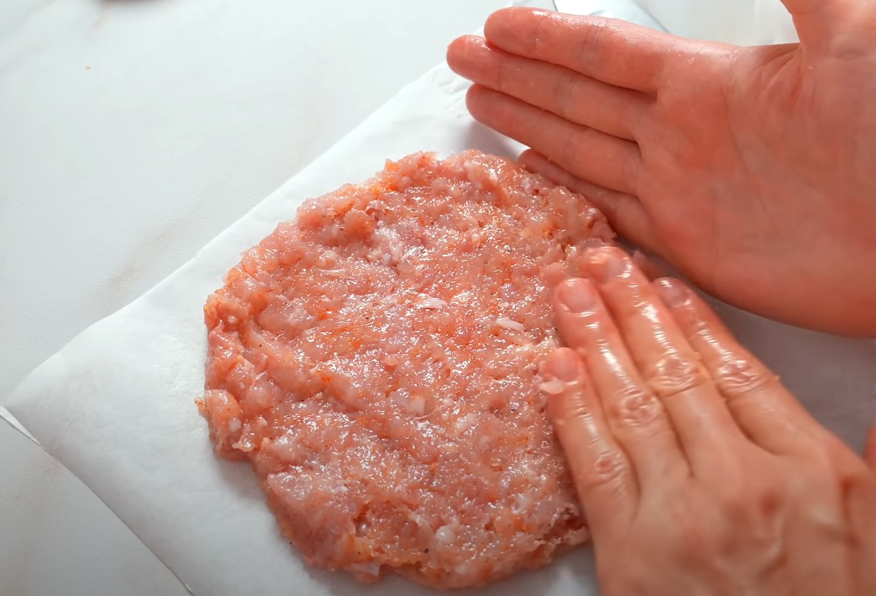 В каждую часть выложить фарш, сформировать лепёшки диаметром 5–7 см.