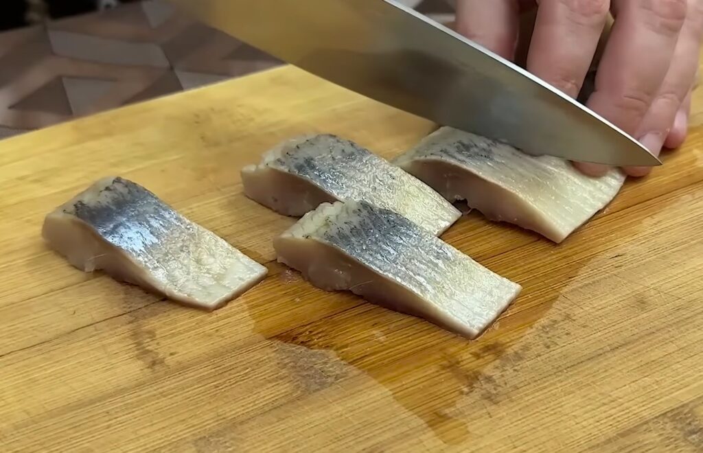 Нарезать сельдь кусочками толщиной 2–2,5 см.