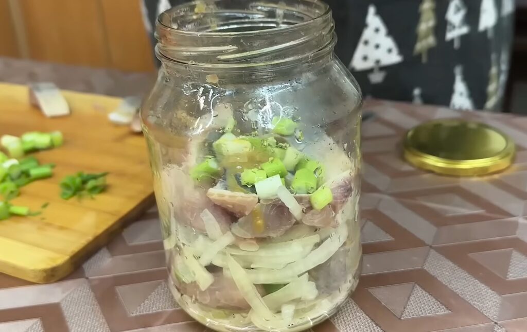 В банку слоями выложить: маринованный лук — сельдь — зелёный лук (по желанию) — маринад. Завершить слоем лука.