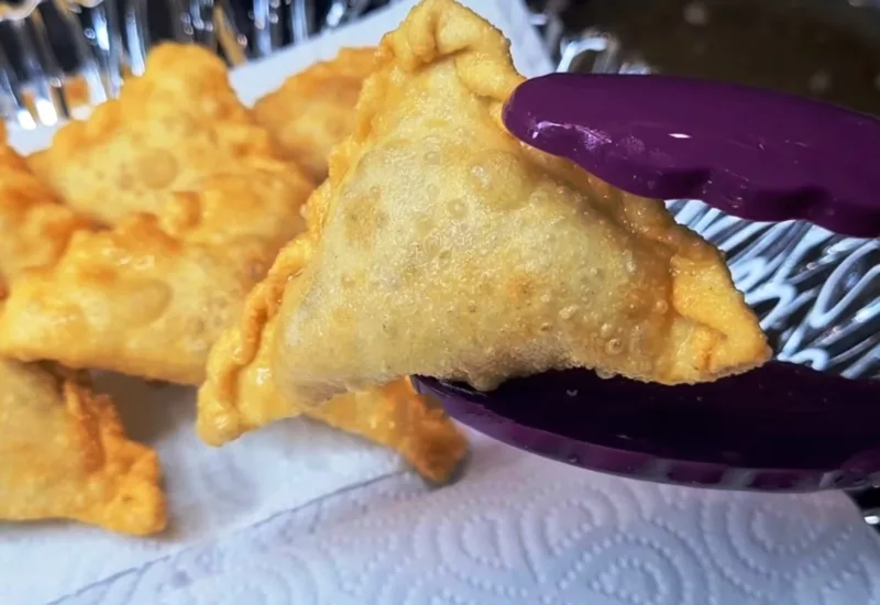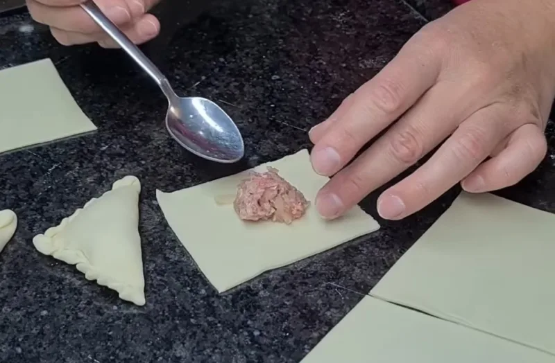 Нарезаем пласт теста на квадратики, в каждый кладем начинку, скрепляем концы, чтобы получились треугольники. Края посикунчиков защипываем тщательно, чтобы не вытекла начинка.