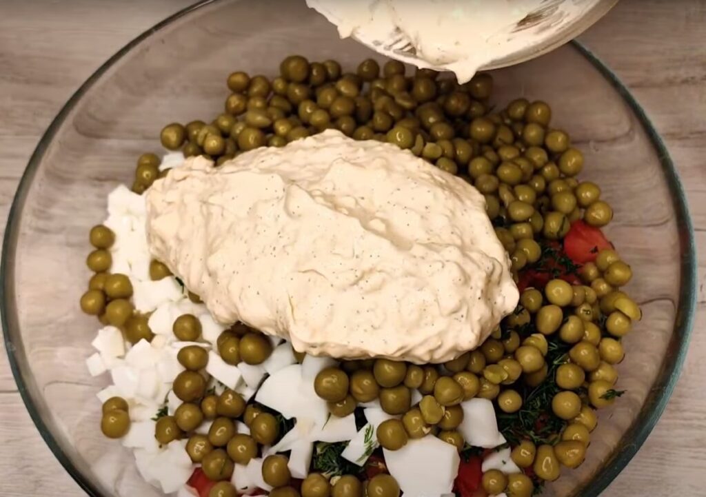 - Яйца разделить на белки и желтки: белки мелко нарезать и вместе с горошком добавить в салат.