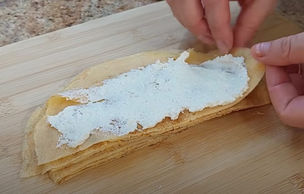 Каждый блин разрежьте пополам, смажьте начинкой и сверните трубочкой.