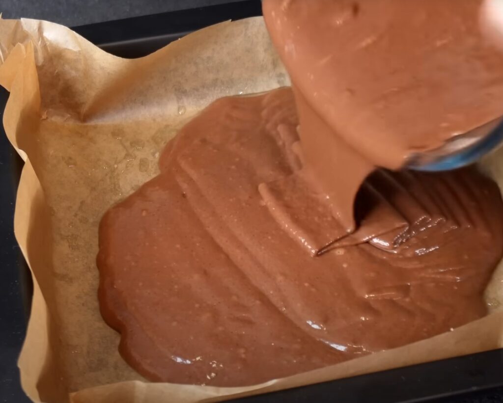 Перемешайте всё и вылейте тесто в форму, застеленную пергаментом.