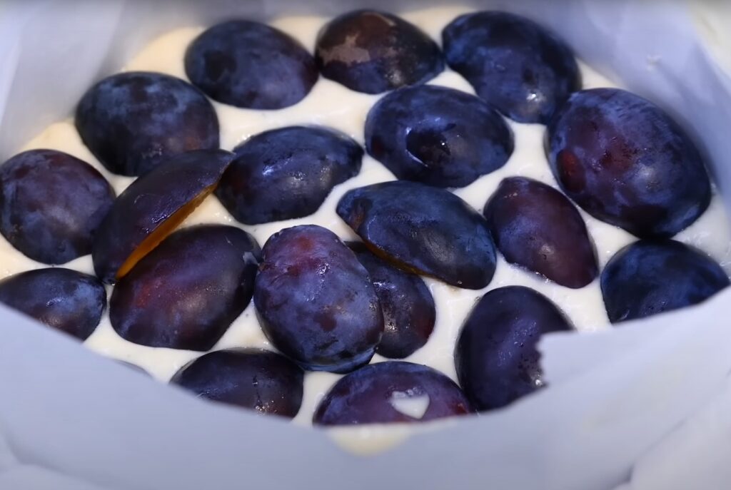 Форму для выпечки застелить пергаментом, выложить тесто. Сверху разложить половинки слив.