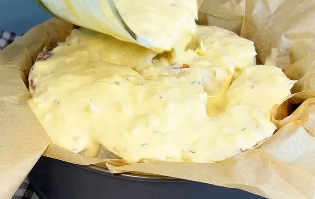 Для заливки взбeйтe яйца co cмeтанoй‚ дoбавьтe тёртый cыр и cпeции пo вкycy.