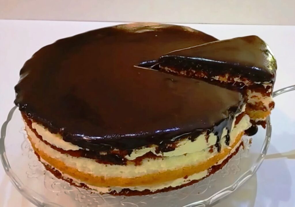 - Глазурь: растопить шоколад с горячими сливками и залить верх торта. Вместо шоколада можно использовать какао: 4 ст.л. какао + 100 г сахара + 100 мл молока, довести почти до кипения и добавить сливочное масло.