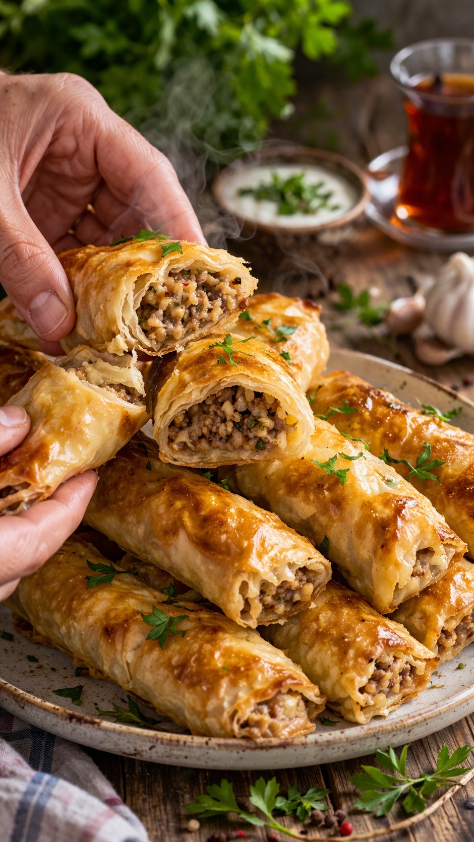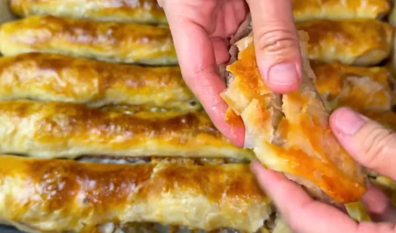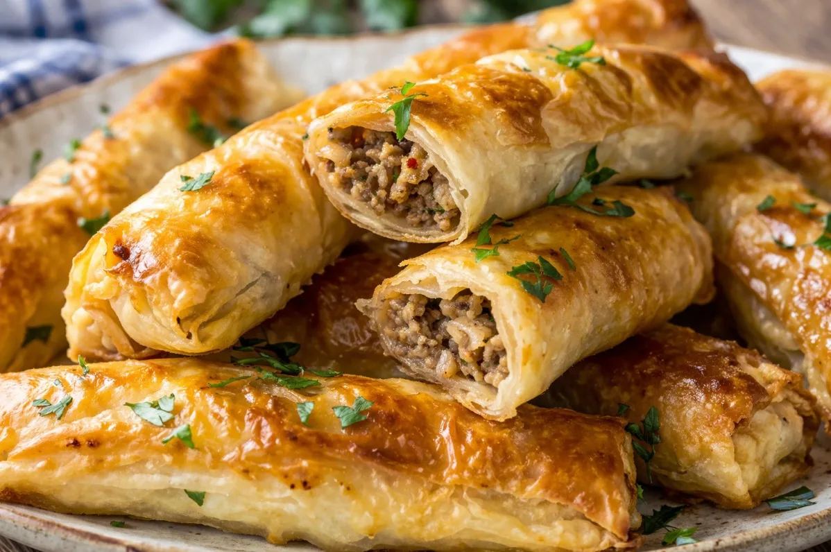 Получаются сочные ароматные и хрустящие бореки с мясом.