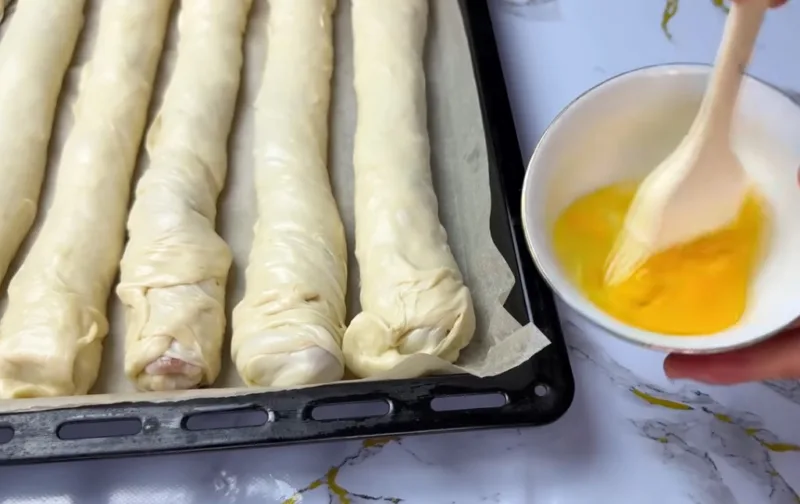 Делаем колбаски из полупрозрачного теста с начинкой, выкладываем их на противень, застеленный пергаментом.