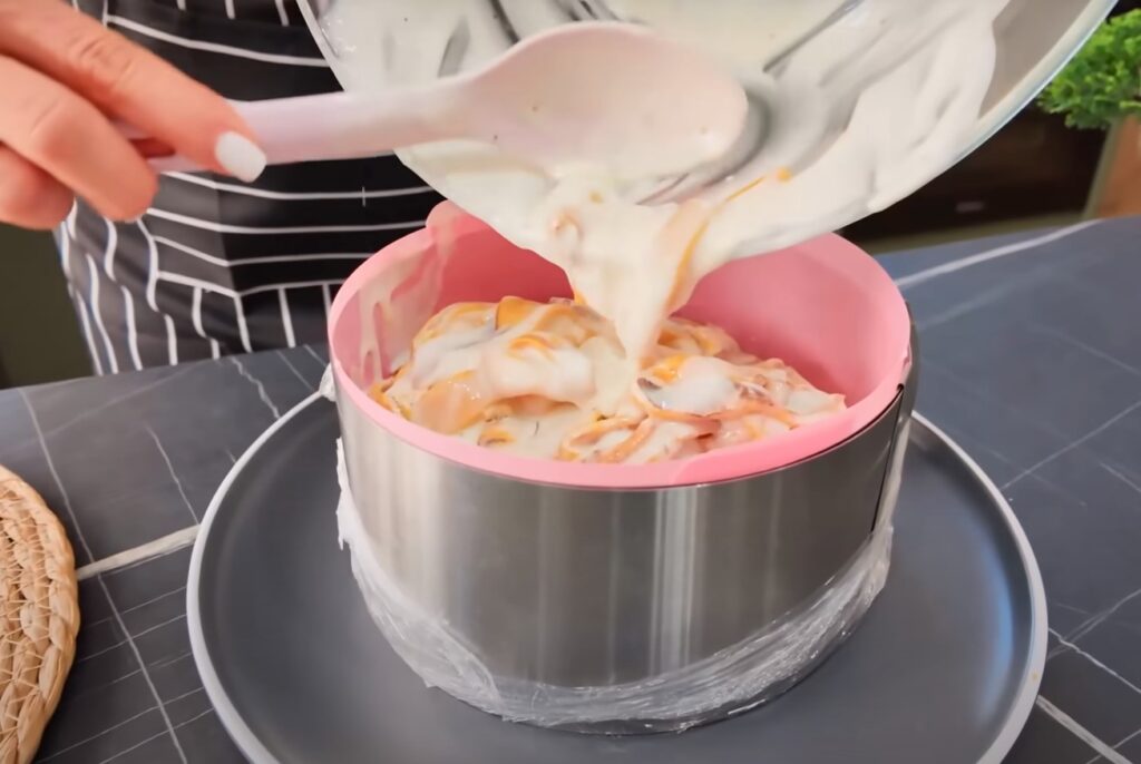 Блины нарежьте полосками, смешайте их со сметанным кремом. Выложите массу в форму, застеленную плёнкой, разровняйте.