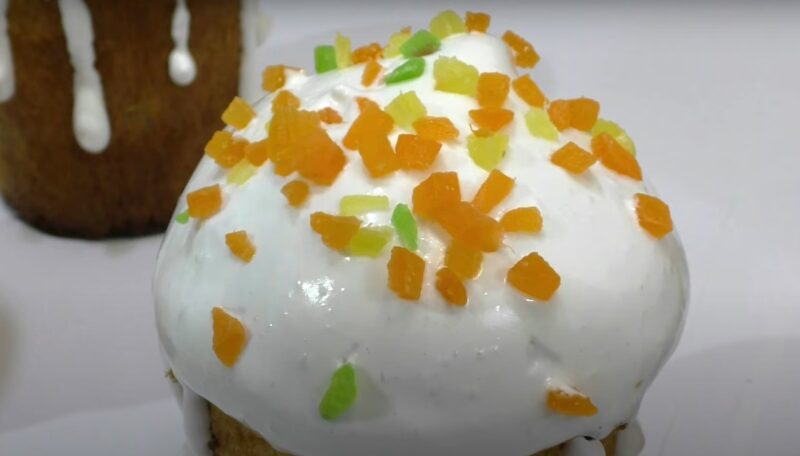 Каждый кулич окунаем в глазурь и оставляем застывать. Декорировать куличи можно разноцветной посыпкой, цукатами.