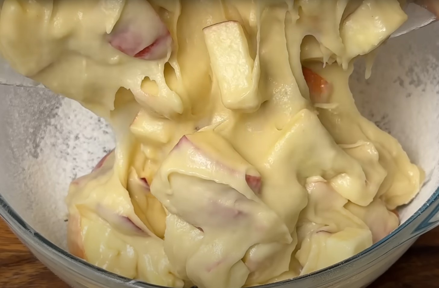 Добавьте яблоки в тесто и аккуратно перемешайте.
