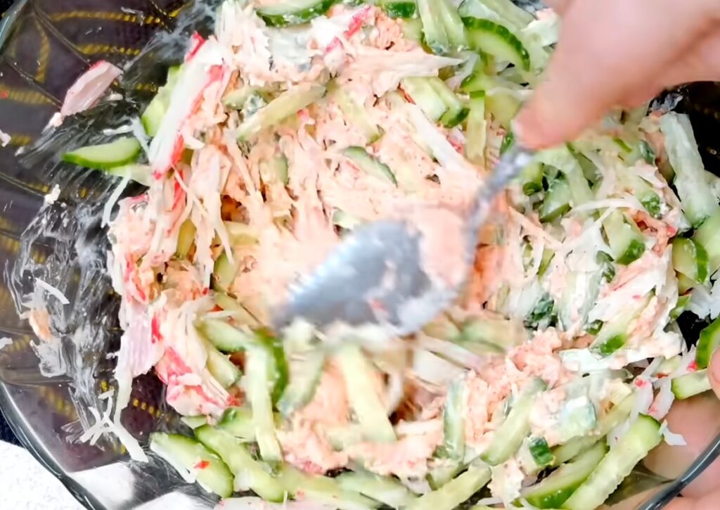 Крабовые палочки мелко шинкуем или разбираем на тонкие волокна. Огурец нарезаем тонкими брусочками и добавляем к крабовым палочкам вместе с креветочной икрой. Перемешиваем, затем добавляем майонез и снова хорошо перемешиваем начинку.